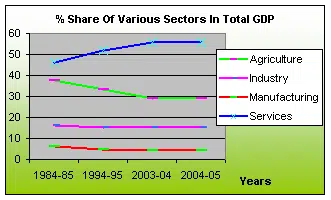 As in the year 2004, the percentage share of services in the total GDP of the country was 55.9 followed by agriculture at 28.9. The contribution of manufacturing to the total GDP is the least.