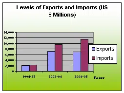 Foreign Trade 2000 2003 2004 Merchandise trade (% of GDP) 81.4 93.0 96.8 Foreign direct investment, net inflows (BoP, current US$) 379.0 million 179.0 million 773.2 million Long-term debt (DOD, current US$) 3.4 billion 4.1 billion 5.7 billion Exports of goods and services (% of GDP) 44.9 51.4 54.3 Imports of goods and services (% of GDP) 51.2 56.8 61.3