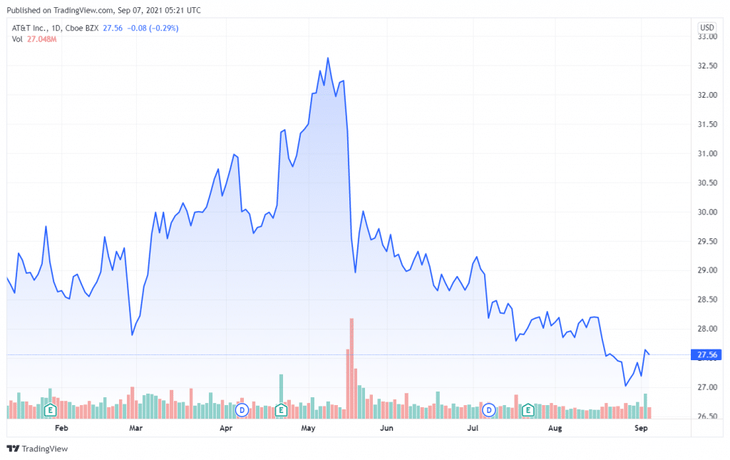 Shares of the American multinational telecommunications company AT&T Inc. (NYSE: T) are in the red today, after closing at $27.56 on September 3rd (19:59 UTC-4). AT&T shareholders are having trouble keeping up with the company’s corporate developments, and the share price indicates their uncertainty. Analysts have been discussing how much the share will be worth after AT&T has decided to spin off its Warner Media division, merging it with Discovery to establish a new company.