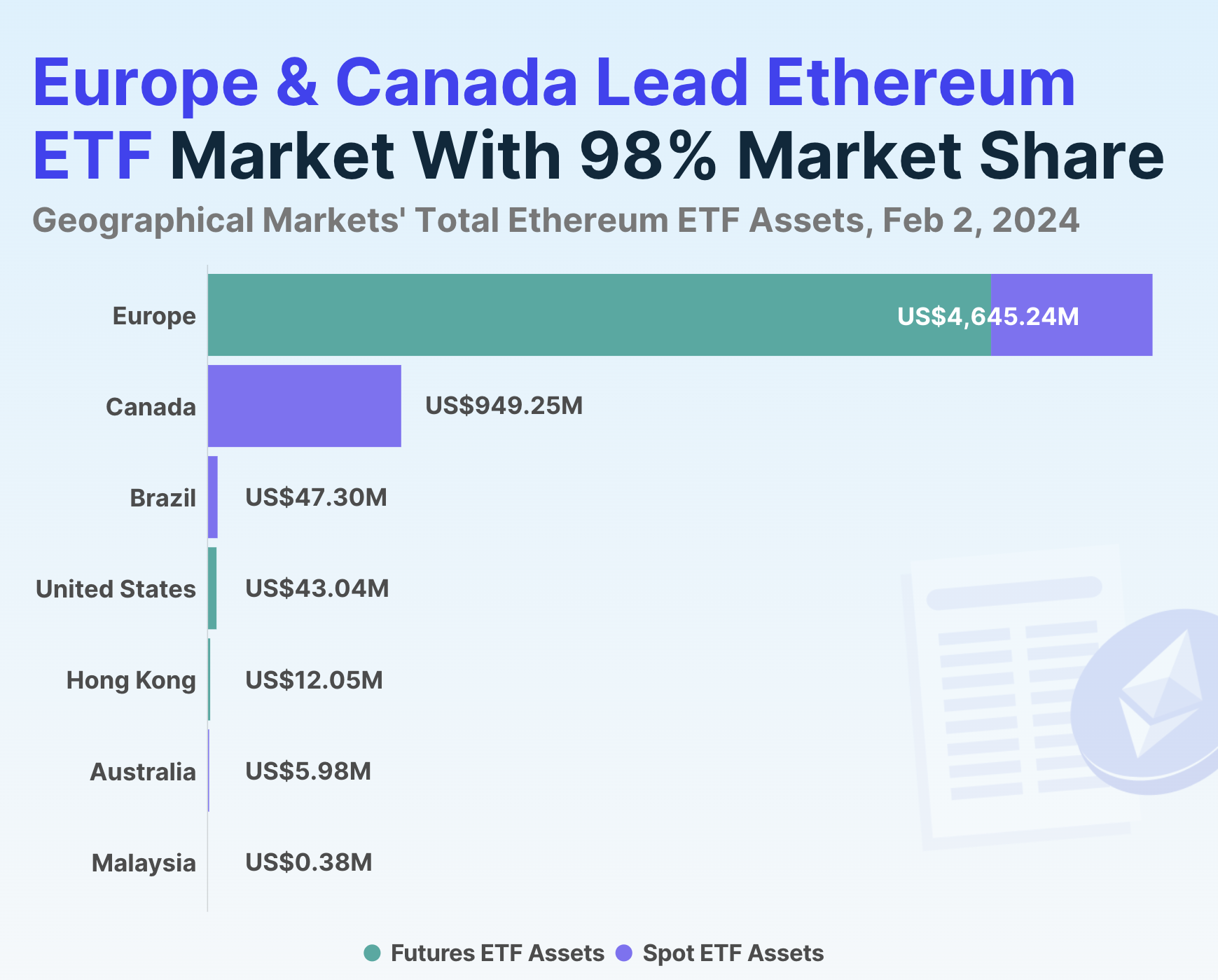 According to the February 2 study, CoinGecko disclosed that Europe and Canada hold a 98% share of the $5.7 billion Ethereum ETF market.