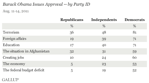 [quote]Gallup’s Lydia Saad added that while the exact cause of President Obama’s decline in approval ratings cannot be conclusively determined, “history will remember this period for the messy political debate in Washington over the debt ceiling, followed by distress on Wall Street and tragedy in Afghanistan.”[/quote]