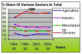 The percentage share of services sector in the total GDP of the country is the highest followed by industrial sector. Services sector accounted for 61.1 percent of total GDP as in the year 2004.